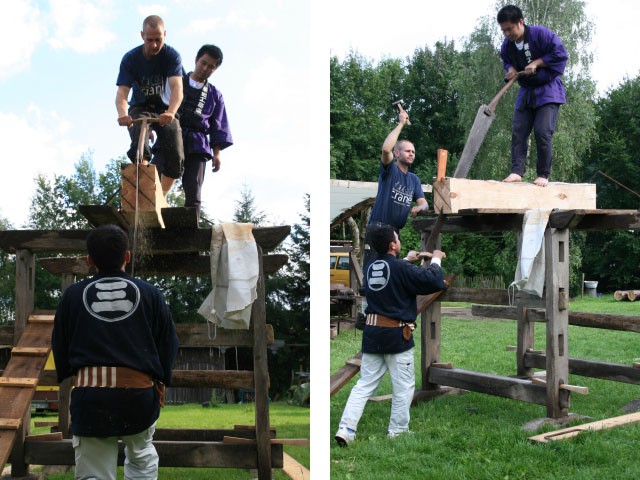 Links: Hischida San Längschnitt mit der Klöbsäge. Ausstemmen eines Falzes am Kasagi (Oberstes Holz) des Torii, Amemiya San. Rechts: Einstellen eines japanischen Hobels zum Schneiden der Oberfläche, Ueki San.