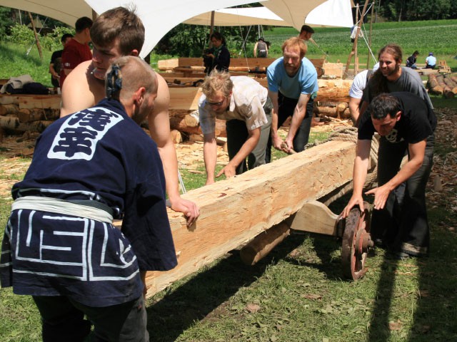 Hochwippen eines 500 Kilogram schweren Balkens auf den Sägebock – mit vereinten Kräften!