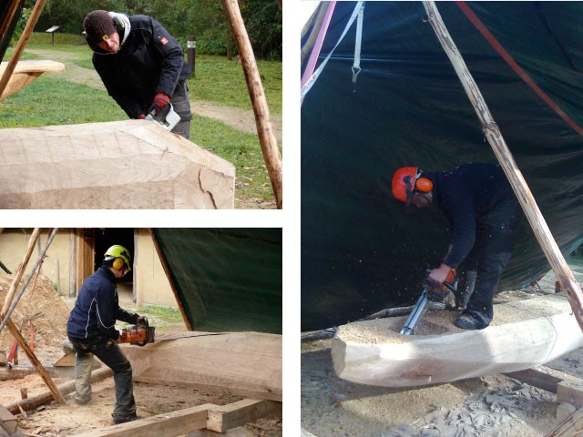 Links: Markus formt das Heck mit der Kettensäge, Hannes formt die Pik (Bug). Rechts: Aushöhlen einer Vertiefung am Anfang und
