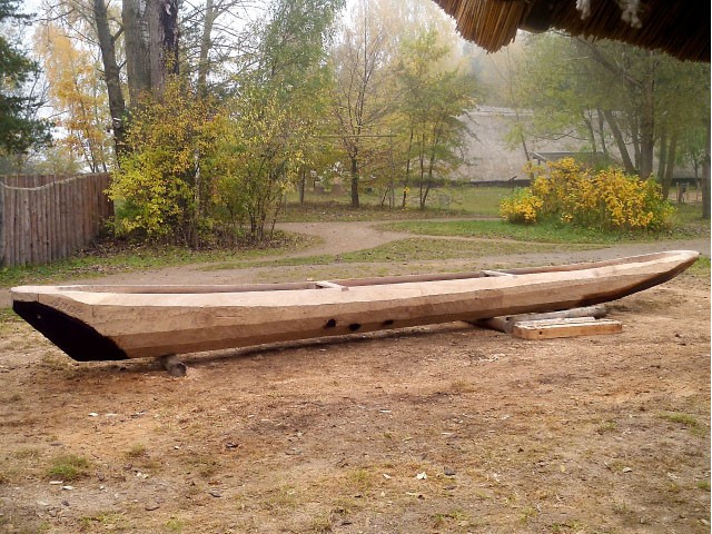 Hier liegt der fertige Einbaum, der in seiner Form einem asiatischen Drachenboot nachempfunden ist.